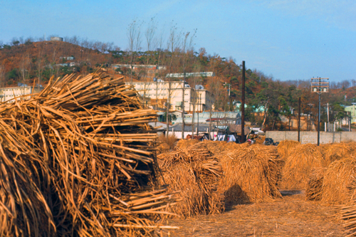 I went for a walk outside the gates of Camp Howze, and was rewarded with these beautiful scenes that express as little else can "Fall in Korea". The golden rice, the purple mountains, and the blue sky combine to make an almost poetic scene. The harvest is beginning. Pretty soon, the entire landscape will be dotted with the mounds of harvested rice.