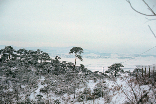 It's a staged photo, with CPT Halloran (he wasn't a close friend and so I'm not sure where he was from), LT Lancaster, and then something unusual- an officer's wife. It this case, it's Mrs. Halloran. (She's looking for North Korean infiltrators, I guess.) I think I said earlier that some officers actually do bring their wives over (at their own expense) and ensconce them near Yongsan in Seoul. (There's some folks that help find suitable housing, but again the officer has to pay for it with his regular housing allowance.) Most times, these officers may go down to Seoul on the weekends, but if they have duty or something, the wife can come up here.