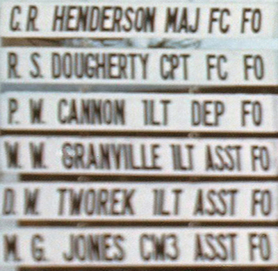 Actually, the sign is identical to what it was when I arrived save for the top slot, which used to read "F FUENTES LTC FC FO". This indicated Francisco Fuentes (he never used his middle name, Carlos), Lieutenant Colonel, Finance Corps, Finance Officer. Now, of course, it is "C R HENDERSON MAJ FC FO" (Charles Raymond Henderson, Major, Finance Corps, Finance Officer). Now we come to my ladder entry. Major Henderson has not been here long, and so there has been no time to change the next two signs. I am no longer the Finance Officer, but am back to being the Deputy Finance Officer. Peter Cannon, who was my Deputy, is back to being an Assistant Finance Officer, just like the other three officers- Bill Granville, Dan Tworek, and Mr. Jones (Maurice, actually).