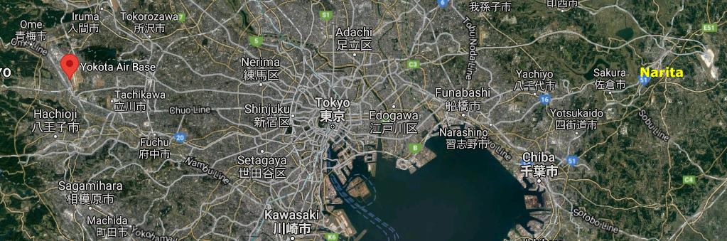 So where is Yokota Air Base relative to Tokyo? Turns out, it is out in the country (at least it was out in the country) west of the city. For those of you familiar with Tokyo, who have flown there in the 21st century, Tokyo's new airport- Narita- is about the same distance east of the center of the city: