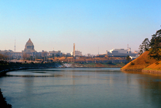 The new, elevated expressway runs along the edge of the Akasaka district, where the Sanno is, and a lot of the new construction in the area is along this highway, which is part sunken and part entirely underground. The results are attractive, and looking North you can see one of the new office structures that has gone up recently. We are going to walk along under this street for a ways, eventually turning southeast to head over to the National Diet Building- the equivalent of our Capitol.