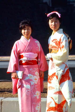 The kimono, I have learned, is actually five separate pieces of clothing. First, there is a kimono-like undergarment, the white material under the pink kimono of the girl on the left. Second is the kimono itself. Third, a stiff wrap-around affair made of cardboard and some kind of contrasting material. Fourth, there is a pad under the front of this wrap-around, and finally there is the folded material that is attached to the back of the outfit. The result is very attractive.