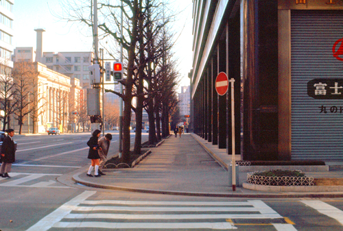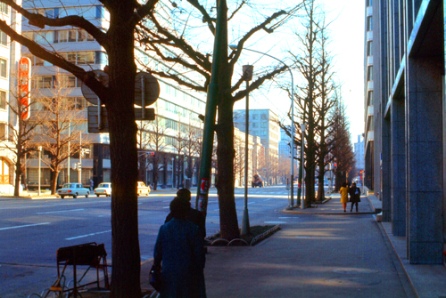 We are walking straight ahead, now, heading south towards the famed Ginza. The area is still pretty much deserted, and would be until we arrived in the Ginza shopping and entertainment area. In the picture below, right, I thought that the air ducts protruding from the ground look like some sort of ultra-modern sculpture. They are, I assume, outlets from a subway station, for I believe that three is one under the intersection up ahead. They could, however, be for the building itself: