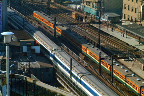 We got off the train and started looking for all the small clubs and coffeehouses described in the guidebook, but we had unfortunately gone out the back, rather than the front, of the building, and thus didn't find what we were looking for until it was too late to stay. We wandered around for a while, up this street and down that one, until we finally got headed in the right direction. It was near here that we encountered the only area reminiscent of Korea that we found, and it was a small area just jam-packed with eating places, all of them small, all of them haphazard, all of them full, and some with very well-dressed people. There were also sidewalk vendors, a few of whose wares we sampled, and it was all very good, but not the kind of stuff you make a meal out of. Noodles and fish predominate, with rice and chicken second.