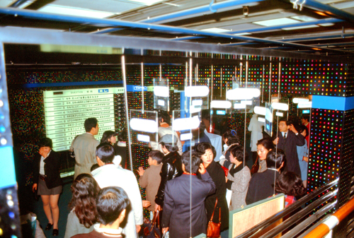 A major renovation was made in 1992, with the exterior restored to its original condition. Exterior louvers and tiles were replaced, new entrance doors were installed, and the small square at the corner of the intersection was renovated. The original facade, a light display consisting of a large number of 5-inch cathode ray tubes, was replaced with 74 aluminum panels. Interior renovation was done at this time as well. Twenty-five years later, in 2017, the entire building was demolished. A new Sony building is to be built on the site, but, at the moment, it is a small park. You can see that park on the aerial view above, although the new building is supposedly now under construction.