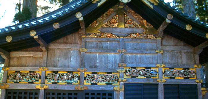 The entire wall in front of the Yomeimon Gate, and well as the gate itself, and other walls around the shrine area are done in a style of intricate carving, and there are many golden bells hanging from the eaves, painted dragons guarding them, and many other animals- real and fantastical.