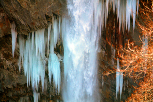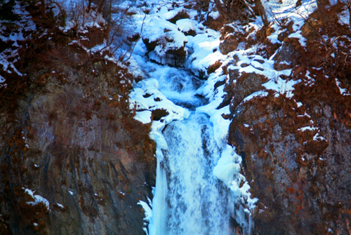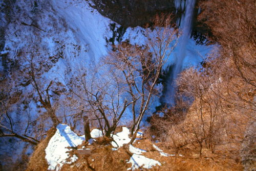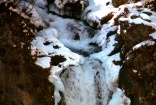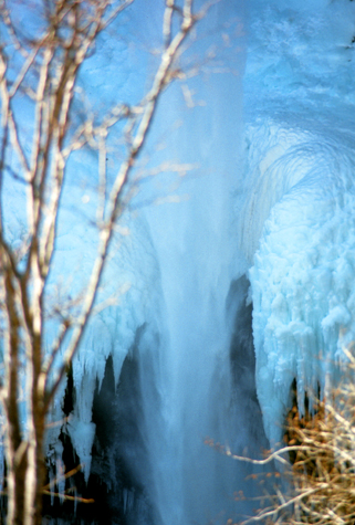 (Picture at left) About halfway down the length of the Falls, the rock walls are so close together that layers of ice have a chance to form, and the layers form a ring around the falling water, building up until the Falls are almost choked off. The blue tint to the ice was quite real.