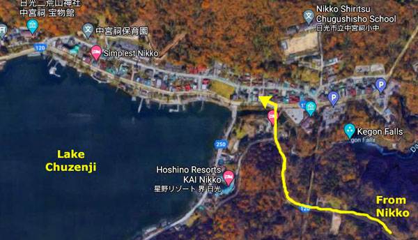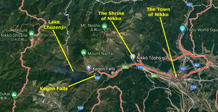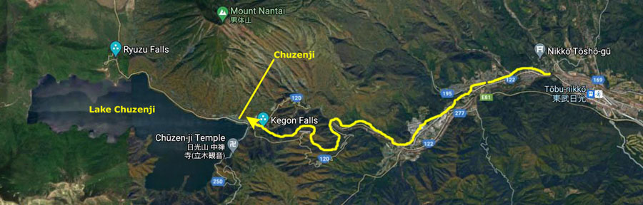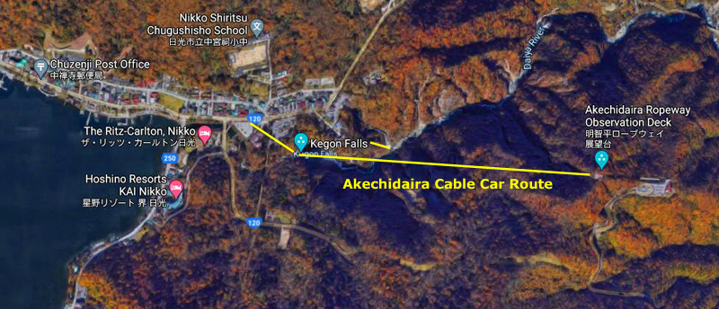 I've put an aerial view (circa 2020 of course) at the left. You can see the town of Chuzenji and where the observation platform is in relation to it. I tried to mark the general route of the two cable car routes, but I think that Google may have marked the falls as being too close to the town. But this is close enough, I guess.