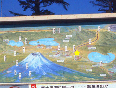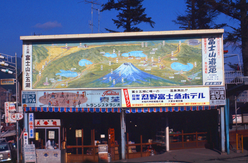 Leaving the station, this sign oriented us, if we could have read Japanese; it is used to tell bus travelers which bus they need to get to a certain point. One of those bus routes, according to the guidebook, takes climbers a couple of miles away to where the main trail up and down the mountain can be found. The guidebook had a lot of interesting information about how to climb the mountain, the various "stations" on the trail where climbers can get food an drink (and even stay overnight), and so on. But since we weren't climbing the mountain (something I would definitely want to do if I were visiting there today), I won't bother copying a lot of that information into this narrative.