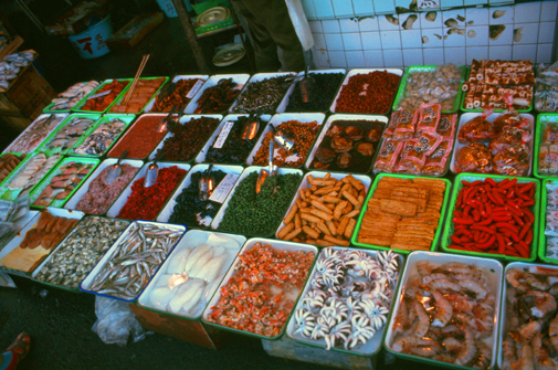 The variety of food available in some of the sidewalk supermarkets. I was not able to identify all the different items, although some of them are familiar.