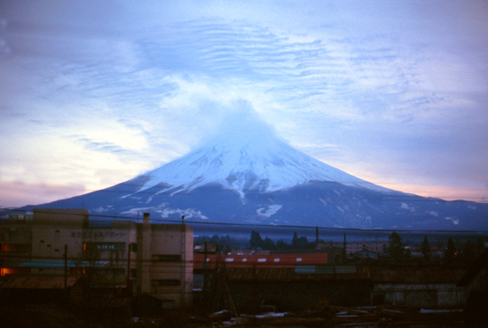 Finally, and very late, a ray of hope. It seems that Fuji is clearing up- but from the bottom. The questions: Would Fuji clear up enough for a picture before the light deteriorated to the point that a picture could not be taken? And, if so, would Fuji clear up in time to allow picture-taking before the train left? Full of apprehension, we continued walking back to the train station, almost not daring to look behind us.