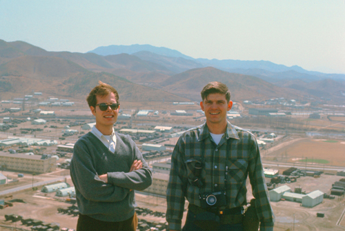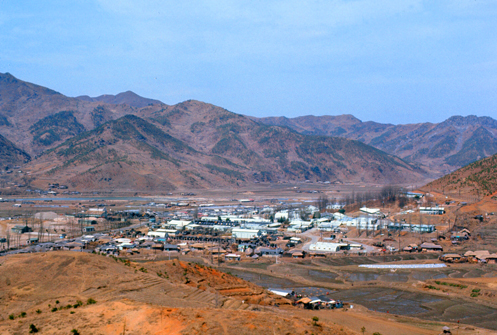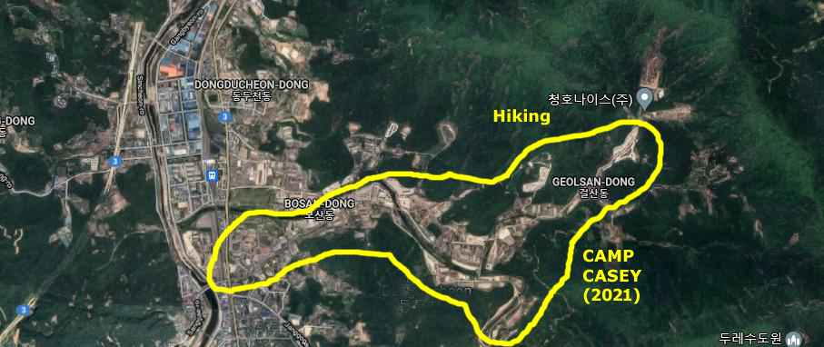 In putting this page together, I have tried hard to compare the pictures I have of Casey from the hills to the north to the aerial views I am able to look at today. Sadly for me, Korea (and Camp Casey) have, in the 50 years since I left, undergone change so dramatic that almost nothing is the same. Even a major bridge over the Shincheon River that runs outside the gate, and the tributary that runs through Camp Casey into it, can't be match to my photos, because in 50 years the bridge that served one lane of vehicles and carts has undoubtedly been replaced by the multi-lane bridge that I can see in today's aerial view. So forgive me if I can't orient you any better to the hike (whose route would also be impossible to reconstruct). I hope that just looking at the pictures I took of Camp Case, the mountains, and each other will be enough.