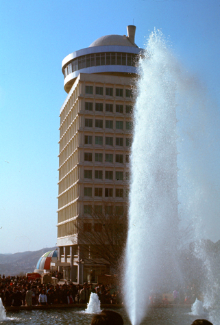 This is the most prominent building among those of the Namsan complex, and it can be seen from most of downtown Seoul. On the ground floor of this building were facilities that were being used by the patrons attending the park, such as a restaurant and such, and on the top of the building there is another restaurant. But as to the intervening floors, we just aren't sure.