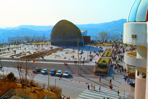 This is a good view looking up Namsan Mountain from the facilities on its lower slope. This structure was a greenhouse or arboretum, and inside were many tropical plants. You can see how busy the mountain is today.