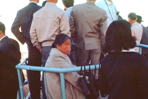 The highest place on the top is a metal platform, and it was always crowded. I photographed this Korean woman renting little telescopes. Her expression was strikingly careworn. |