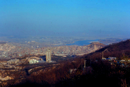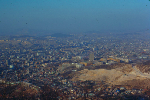 But it is interesting to look up towards the top of the mountain. In my investigations in 2022, I saw that a structure called the "N Seoul Tower" sits atop the mountain. You can look at pictures of it online; it looks like a much smaller version of Tokyo Tower. Anyway, I was puzzled by the Wikipedia article that said the tower was constructed in 1969, because here, in this 1971 picture, the tower does not appear.