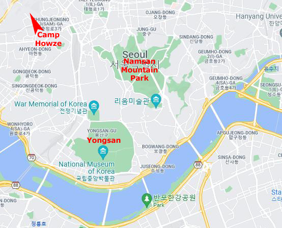 At left is a map of a small area of downtown Seoul, and on it I have marked the location of Namsan Mountain Park and also the Eighth Army Yongsan post a bit south of that towards the river. The two are a little over a mile apart. Below is an aerial view (circa 2020) of the Namsan facilities: