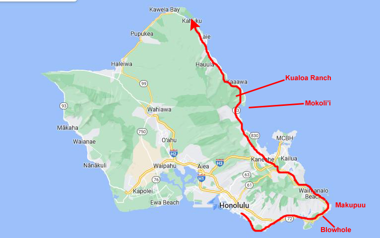 On this, my first day, I am planning to simply drive along the coast road from Waikiki all the way to Kahuku Point- the northeast tip of Oahu. I will circle south of Diamond Head and then up the coast past another extinct volcano crater at Koko Head.
