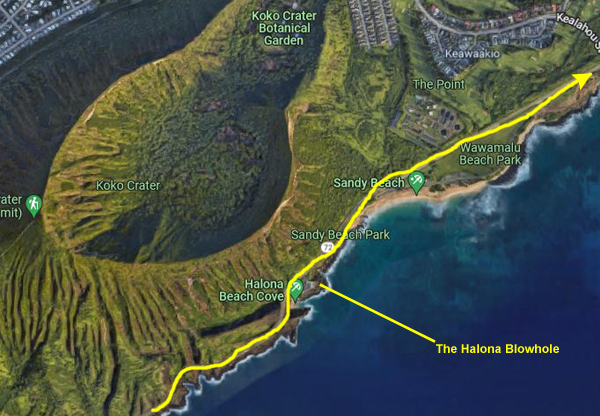 Koko Crater is the large tuff cone that visually dominates the area, while Hanauma Bay is another tuff ring that has been breached by the ocean. Lānaʻi Lookout is a scenic lookout that features a very distant view of the Island of Lānaʻi and a better view of Molokaʻi. I am parked, of course, at the Hālona Blowhole- right across from Hālona Cove (best known as the site of the love scene between Burt Lancaster and Deborah Kerr in the movie From Here to Eternity. Finally, just a few hundred feet up the coast is Sandy Beach, popular for surfing and extreme water sports.