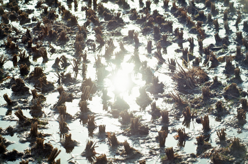 In this picture, a close-up of a rice paddy in Winter, you can see that the ice has melted but the fields have not yet been plowed. This will not occur for another month or so. The fields will dry out a bit, be plowed and planted, and wil then be flooded again for the rice to grow.