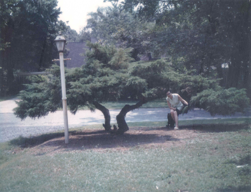 I have no idea who took these two pictures, or even why they were taken. They are of my mom down by the low juniper bush at the corner of our driveway and Somerset Drive. When my sister and were little, this bush was way overgrown, and we could actually get inside it. At some point it was cleaned up and trimmed.