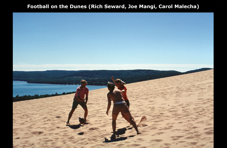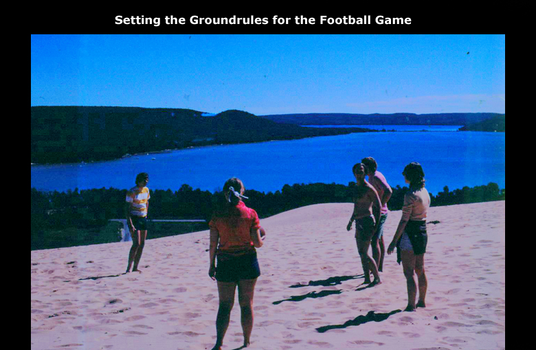 There are two things I do know and did record. One was that we had the use of the Seward family's motorboat, and that we took it out once or twice on a lake between their house and the state park. (I remember this because I tried water skiing for the first time, and when I fell off the skis, I lost one of the two pairs of glasses that I brought.) The other was the fact that we spent most of our time at the State Park. We did a lot of neat things, fishing, water skiing, climbing the sand dunes, and so on. Carol got her nickname of "Cruncher" from the football game played on top of the dunes one afternoon. We had cookouts and the whole bit, everyone thoroughly enjoying themselves.