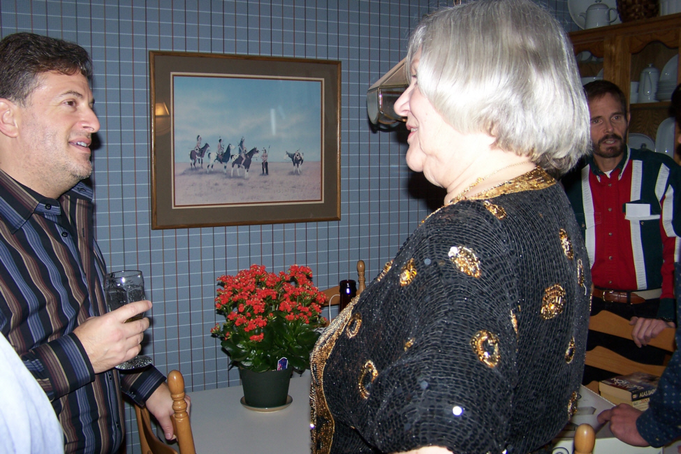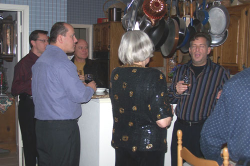 First, Fred took a number of candid shots of Tim Brown (tall with glasses), Rich (solid-color blue shirt), Greg (dark yellow turtleneck), Barbara (sophisticated gray-haired lady) and Lou (vertical-striped shirt) drinking and chatting in the kitchen. You can see these pictures both above, left, and below.
