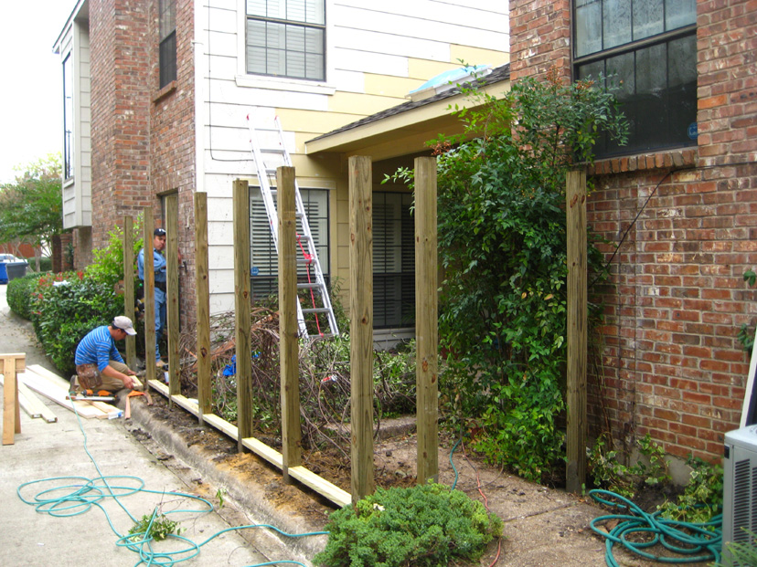 This is the last shot of the day. All the posts have been positioned, although they have not been set in cement yet. But each one of the posts that you see will be anchored in the ground and set in concrete. Jack assures me that this new fence will last the lifetime of the house, and won't be going anywhere no matter how much you try to move it. The crew has done a lot of work for one day.