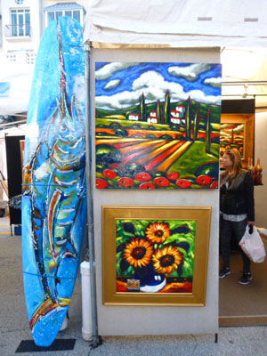 By far the most common offering at the Art Fair are paintings, which I guess is what most people would immediately think of when the term "art" is used. Some of the paintings are pretty traditional, using traditional media such as pastels or oils. Others use additional media to set themselves apart.