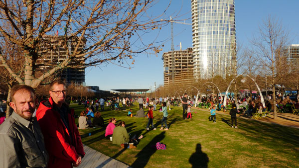 The landscape designer created different “rooms” throughout the 5-acre park. The sustainable landscaping includes 37 native plant species and 322 trees, hiding an active freeway with a beautiful green area. There are open lawns, rows of trees, a children's playground, a performance stage, an outdoor library, water features and areas for a restaurant and for a series of upscale food trucks that provide service all day long.