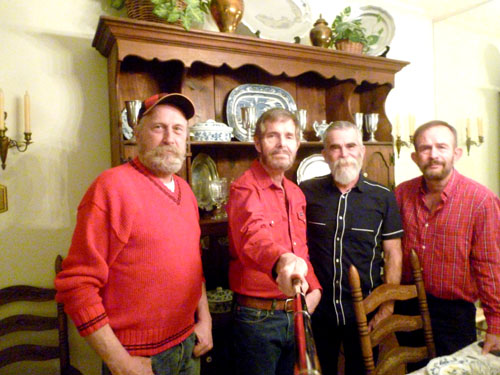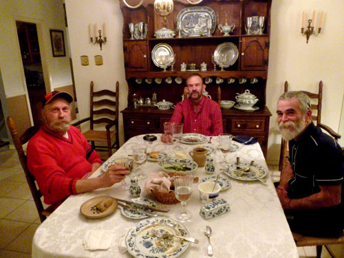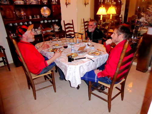 Fred and I just futzed around for most of the rest of the day, going out for a walk and doing routine things until Justin and Gary arrived about 5:30 bearing gifts. It is always a pleasure to have the guys over for a meal; they always have lots of stories to tell, many of which involve the various dog shows that Gary and Justin go to with their championship dogs. (Justin also brought a frozen casserole for us to put in the freezer and enjoy sometime when we don't feel like cooking.) Both Fred and I took a few pictures during the meal, and these are below: