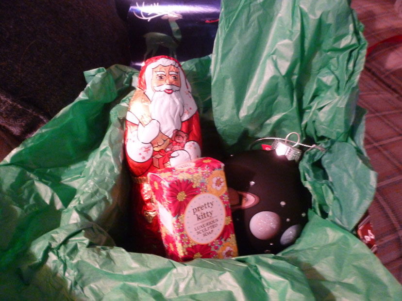 I didn't really have to get it in the oven very early, so we did our opening of gifts. We took some interesting candid pictures during this process, and I've included some of them in the slideshow at left.