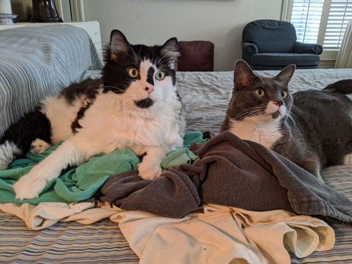 This afternoon, Lucky and Bob had homesteaded my recumbent bike clothes just taken from the dryer (as one or more of the cats always do). They looked particularly photogenic, and so I took a couple of very similar photos: