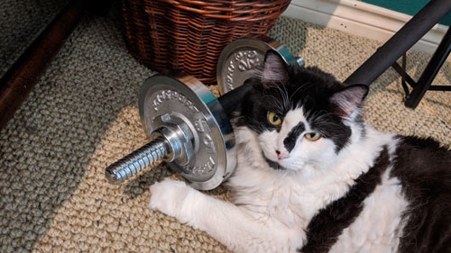 I just thought this was an interesting picture, as it looks as if Lucky wants to do some exercises but is frustrated because he can't figure out how he can pick up the dumbbell.