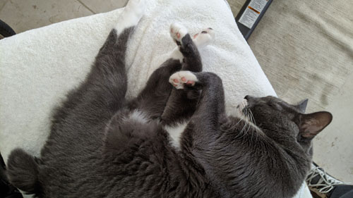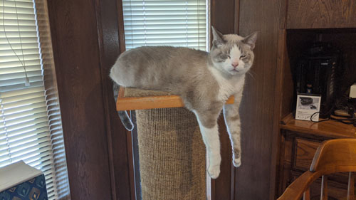Sometimes, when Zack is atop the cat tower, both his front paws will be hanging down either side of the tower, and that is always pretty amusing.
