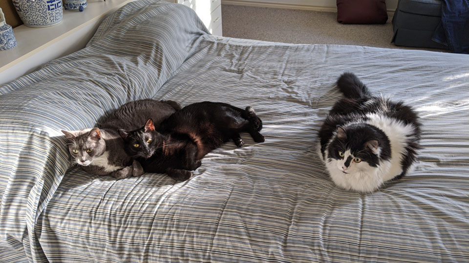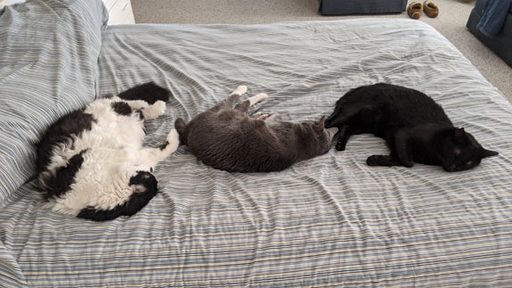 Sheltering in place is a lot easier with the cats in residence- particularly when Fred isn't here. Today, for example, he has Zack with him at his house, so I am left with Cole, Bob, and Lucky. This afternoon, they are all asleep together on the bed- not a typical experience. So I took this opportunity to take a couple of pictures.
