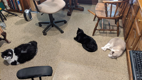 With four cats, it sometimes seems as if we are living in the Star Trek episode "The Trouble With Tribbles", in which the Enterprise takes aboard a single furry animal called a tribble. Unbeknownst to the crew, they are incredibly prolific (they are actually born pregnant), and soon the ship is littered with them. When the cats are lying all about, that's what they remind me of. But it is always a pleasure to pick 'em up and pet them.