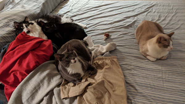 I did not take long at all, particularly since a couple of felines were already in the room, for cats to settle in on top of them. I am not sure where Cole was, but Bob, Lucky, and Zack took immediate advantage of my not needing to put the clothes on right away.