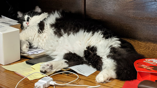 Lucky is so big and has so much fur that no matter where he lays down, it doesn't much matter what he is laying on- he has plenty of padding to make almost anywhere comfortable. There is usually lots of stuff on the desktop, but that doesn't bother him.
