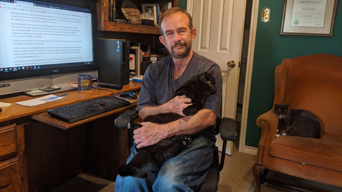 So one of the common situations around my house occurs whenever I sit down in a chair in the study; if Zack is around, he will get up from wherever he is and come over and get in the chair with me. Usually, he sits on the chair arm and just keeps me company, but if I entice him he will snuggle down beside me. This does sometimes make it hard for me to drink something, eat something, or even read a book, but that's what happens. And he will stay there until I get up. It's endearing, but he does get in the way sometimes.