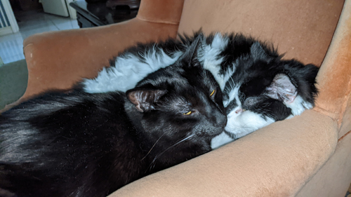 It is also usually true that the youngest cat in a group will latch on to one older cat or another, and perhaps feel more comfortable with that cat than the others. If any such bonding has occurred, it is with our oldest cat, Lucky, and our youngest, Cole. As the old man of the bunch, Lucky is pretty chill, but even so, it is rare to find two of our cats snuggled up as closely as Lucky and Cole were this afternoon.
