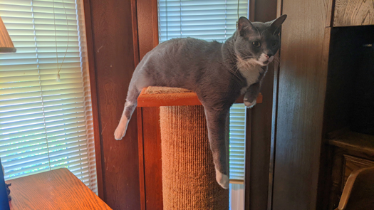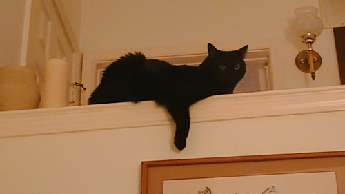 Laying atop the cat tower is one thing; it's only a few feet high. But Cole has taken to a more dramatic perch.