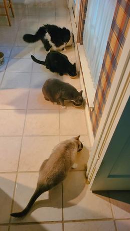 We rarely get pictures that show all four cats at once, but that's only because whe don't usually have our camera phones handy when they get their morning cat food. This picture shows the typical arrangement- Zack, Bob, Cole, and Lucky. This only lasts a minute or two, the time it takes the fastest cat (Bob) to consume his portion.