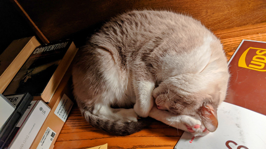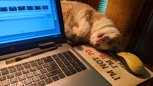 You've seen Zack beside my laptop before, but here he's encroaching more on the mousepad. I actually decided to get up and do something else rather than try to move him. |
