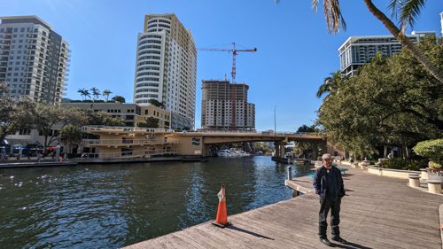 The picture at right shows me standing in the park-like area at the restaurant, and the view is upriver, with the Las Olas Grand the main building behind me. And in the picture below, you see Fred standing in this same park area, again looking upriver, but this time with the New River Landing complex in the background (on the south side of the river).
