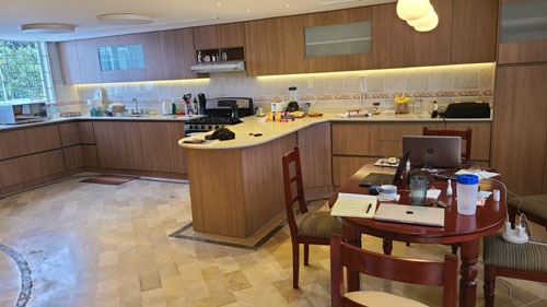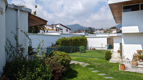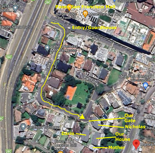 Anyway, we are in the southeast corner of a gated community right behind Paseo San Francisco; the community is called Santa Lucia Baja. Most of the homes are single-family, although there are a few multi-family structures. Our house is one of three that are inside yet another gate; all three were built by the developer of the community and all three were originally owned by family members. Two of them still are. When the developer died, his widow didn't want to occupy the huge house by herself, so a small house was built for her on the site of the tennis court that used to be in the little compound, and her house was bought by a General in the Ecuadorian Air Force (please, don't ask; I have no idea why Ecuador needs an air force)- General Barallas. That's who we bought the house from.
