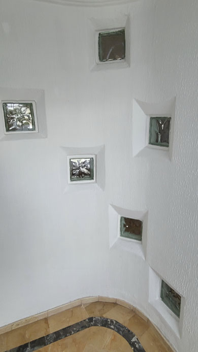 The curved wall with glass blocks is just one of the interesting architectural details in the house. From behind the wall, just outside the social bath, is a picture of the glass block wall as you would see it upon exiting the social bath.