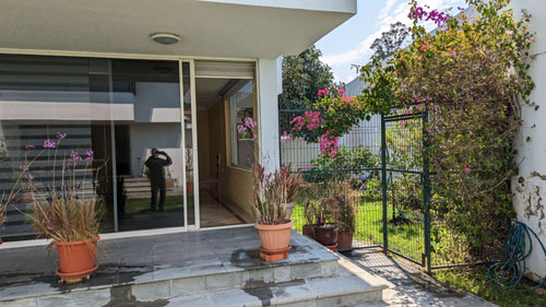 There is a pedestrian gate at the left that requires a key, and an auto gate that requires a clicker to open. Either way, you find yourself in the little common parking area with our house right in front of you, Dario's house to the right, and Nicholas' house to the left. Nicholas and we have carports, while Dario has a parking area kind of underneath his house. Both Dario and Nicholas have rented out rooms in their houses to students who go to the University of San Francisco (which is just across the main road north of Paseo San Francisco and so very convenient for them).
