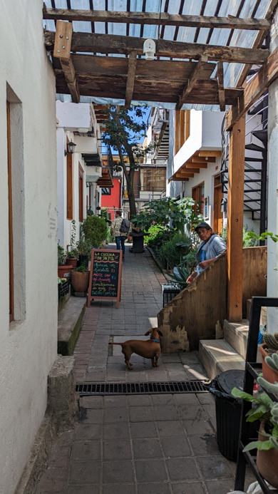 Walking down this street I passed the entrance to what seemed to be a very narrow entryway. I went in, taking care not to upset the dog (who was pretty chill) and found a couple of little cafes and a residence or two.