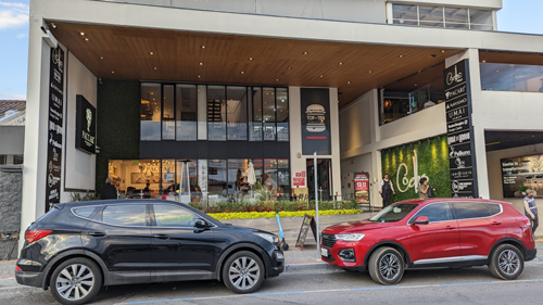 Around a curve, the street begins to slope downward significantly, and there are more little multi-storey shopping buildings. There was also a branch of a local burger chain.